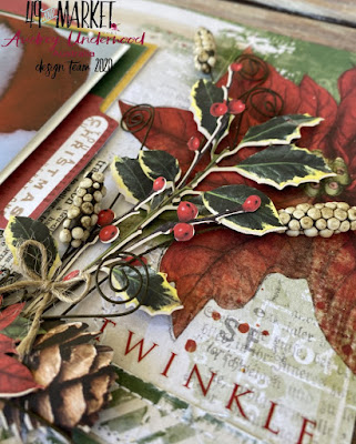 I used Vintage Artistry Noel for this page. As soon as I saw the poinsettia I knew I needed to have two pieces of the same paper so I could play with the petals of the flower and add depth by curving them, then applying some liquid silicone to keep the shape and height, to the back and popping them back in place.
