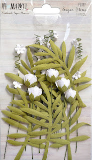 I gathered the strip of tulle using a large stitch and pulled it tight around the waist of the form then added some hot glue to secure it. I then sewed another gathering stitch through the middle of the Lacey trim in white and pulled and secured that in place on the waist also, adding hot glue for extra strength. I made two little tags from the laser cut from Vintage Artistry Teal 6x6 Collection, added two very messy bows to them with some embroidery thread in teal. I added more of the thread to the front right of the dress form then glued two of the lager Sugar Posies in Fluff over it. I then glued three of the Sugar Stems in Fluff to the right of them followed by a chipboard flourish then the two tags. I then placed some Wishing Bubbles and Baubles in Teal and Sky in place on the tag and the tulle. I finished off with a chipboard heart and arrows.